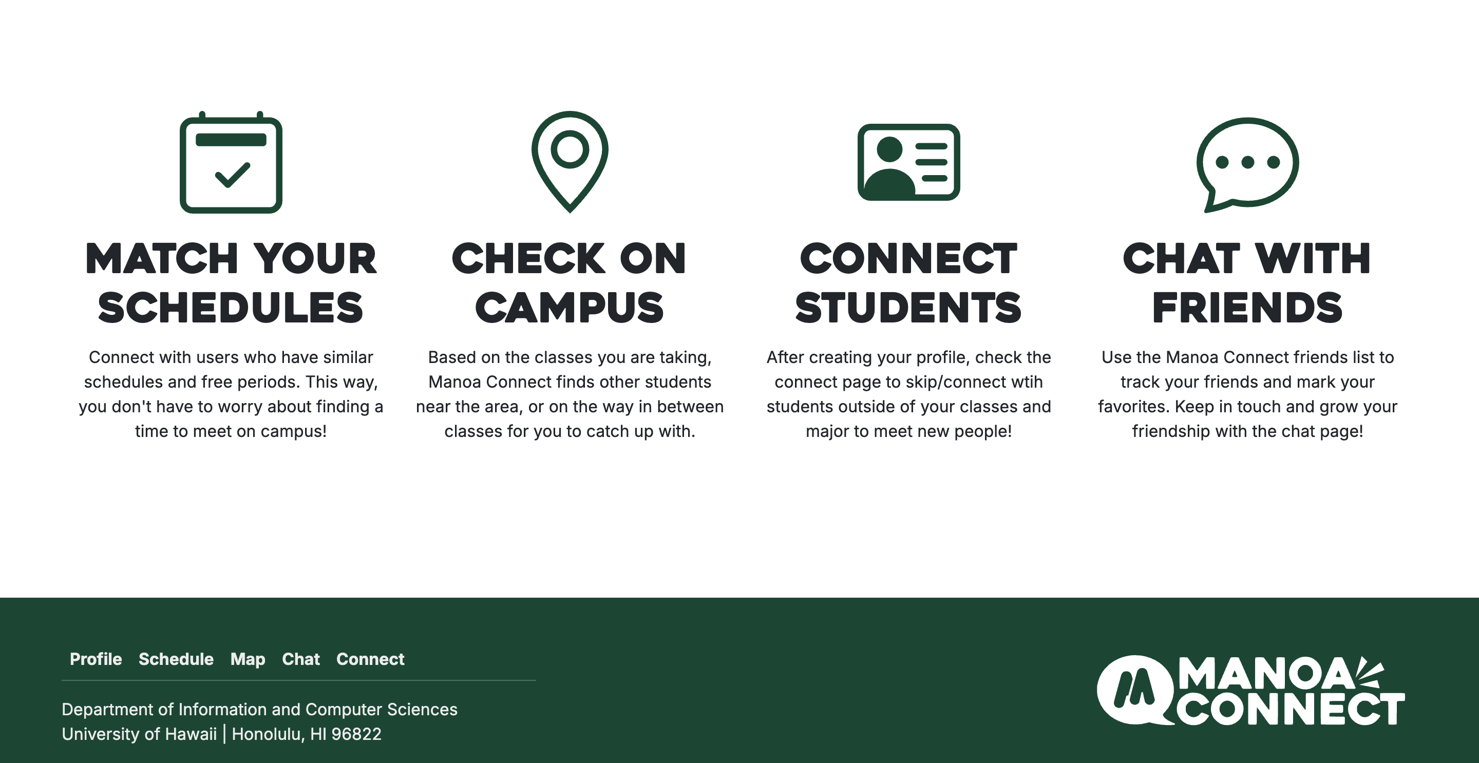 Through this experience, I found myself to be very productive and the project to be developing at a rapid pace alongside my skills. I went from being shaky with React elements, object relational mapping using Prisma, and Vercel deployment to seamlessly building, testing, debugging, and eventually launching the side. Within the span of 3-4 weeks, my team and I were able to produce a generally functional output ready for desktop users, with the Manoa Connect having most of the features we intended it to (profiles, picture uploading functionality, chats, matching function, personal schedules).