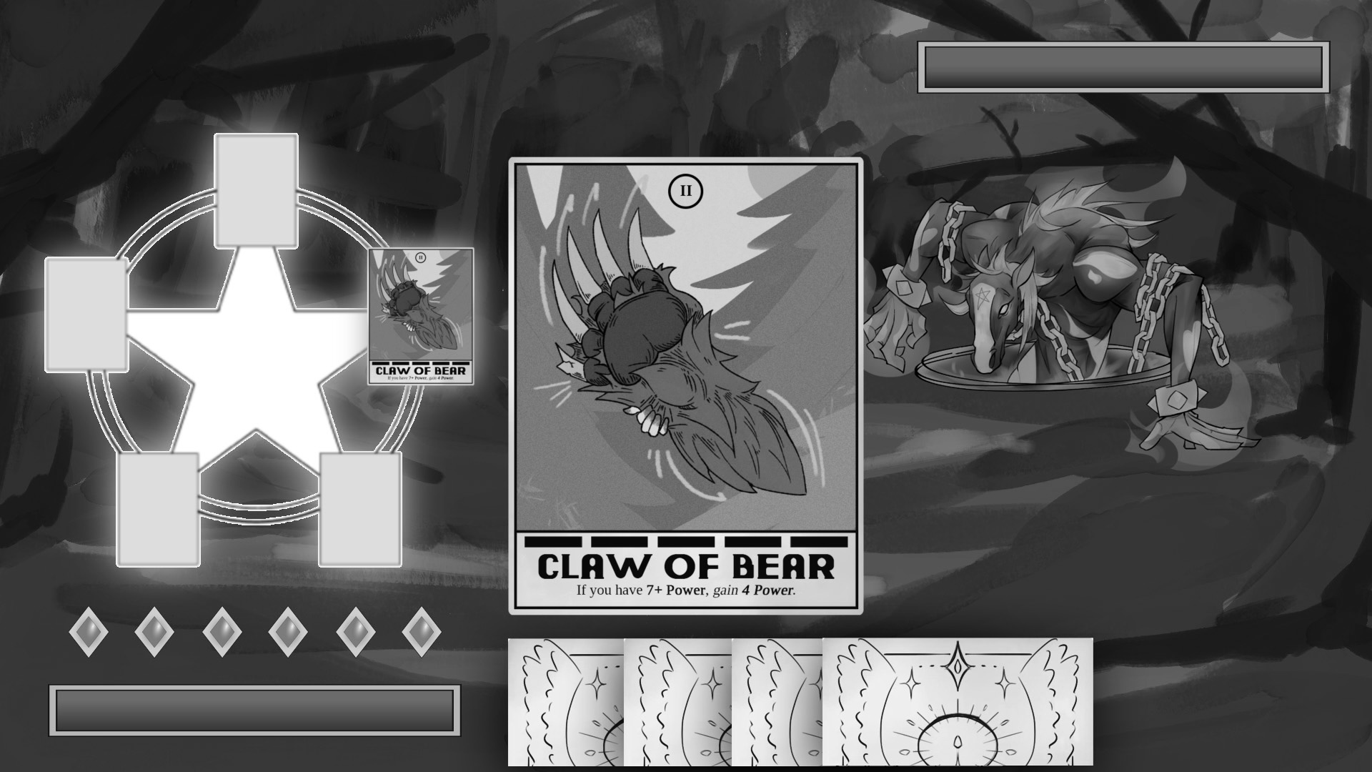 An interesting challenge I encountered was finding the correct balance between realism and a stylized art style. It would be too taxing on the small art team to create realistic art that is fully rendered for a large number of cards, but leaning too heavily towards traditional tarot card style would restrict creative expression. Instead, I merged the two to develop a realism-inspired art style that mainly implements the stylized tarot hatching for the shading, while painting the background/foreground aspects with no line art. The result is a vibrant and focused piece that draws the player’s attention to the shaded details while still providing an aesthetically pleasing and recognizable “bigger picture” to look at, even from afar. These cards are designs made using this philosophy and from the ‘Bear Set’ with its own unique card mechanics, hence the unified color palette. It can be seen that the content of the art is an illustration but “taro-eqsue”, fitting well into the grim, gothic 14th century aesthetic.